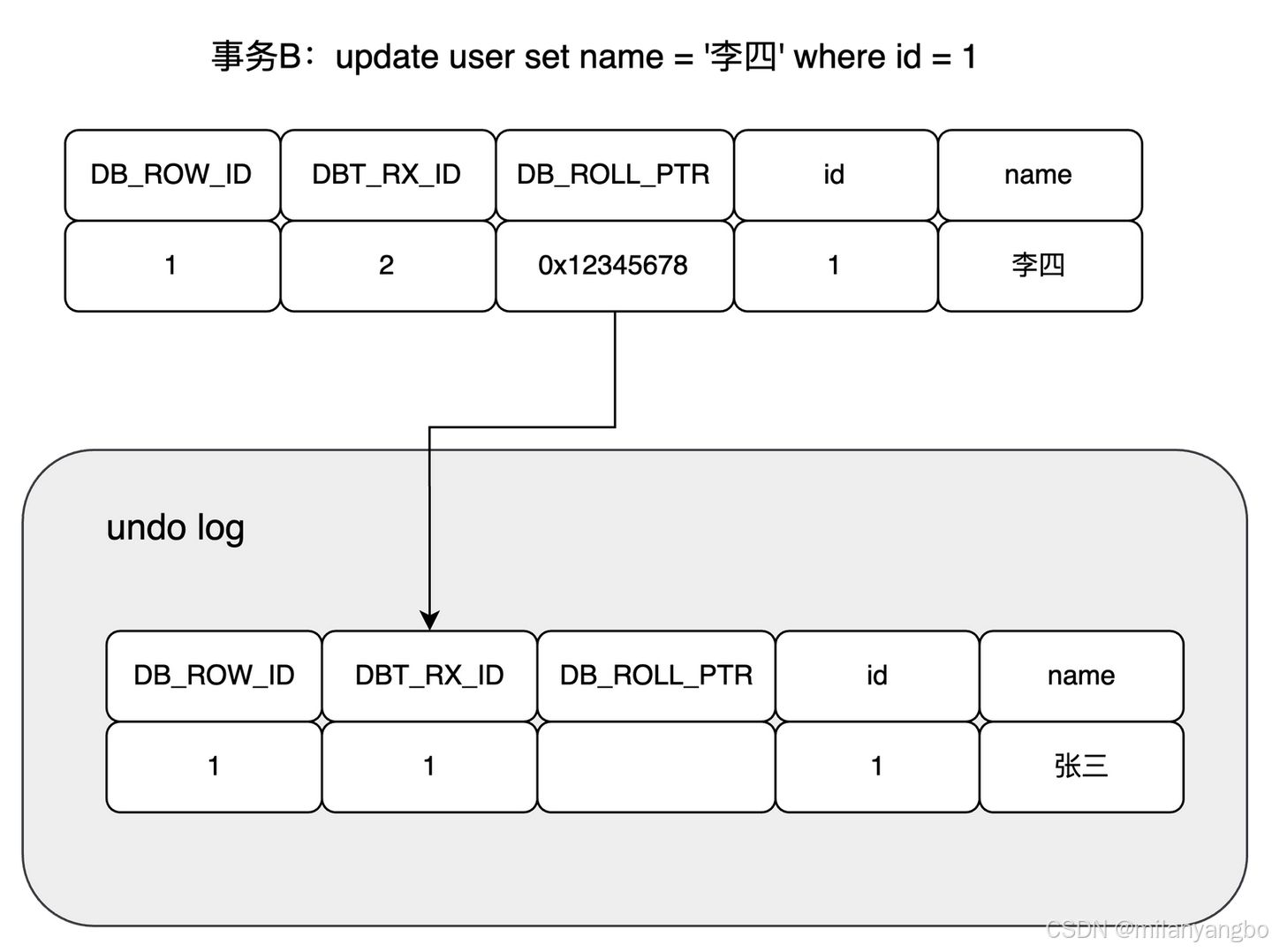 拷贝完毕后,修改该行name为"李四",并且修改该行的事务ID为当前事务B的ID, 并将回滚指针指向拷贝到回滚日志的副本记录,即表示上一个版本就是它,事务提交后,释放锁。