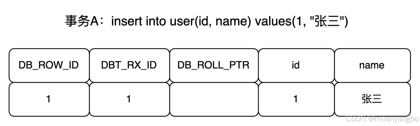 举个例子,比如有个事务A插入了一条新记录:insert into user(id, name) values(1, '张三')。