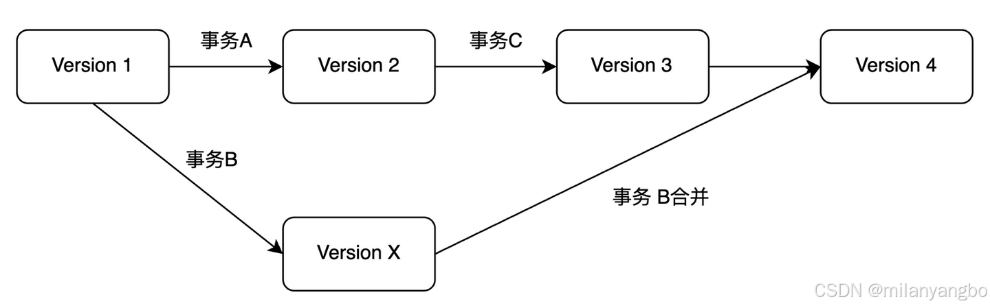 如图所示,基础数据的版本为1,同时产生了两个事务:事务A与事务B。这两个事务都各自对数据进行了一些本地修改,这些修改只有事务自己可见,不影响真正的数据。之后事务A首先提交,生成数据版本2;基于数据版本2,又发起了事务C,事务C继续提交,生成了数据版本3;最后事务B提交,此时事务B的结果需要与事务C的结果合并,如果数据没有冲突,即事务B没有修改事务A与事务C修改过的变量,那么事务B可以提交,否则事务B提交失败。