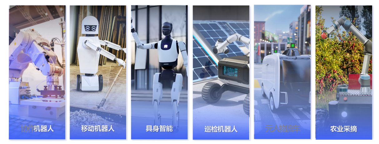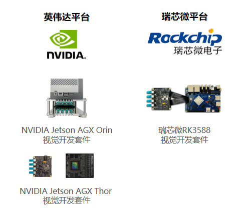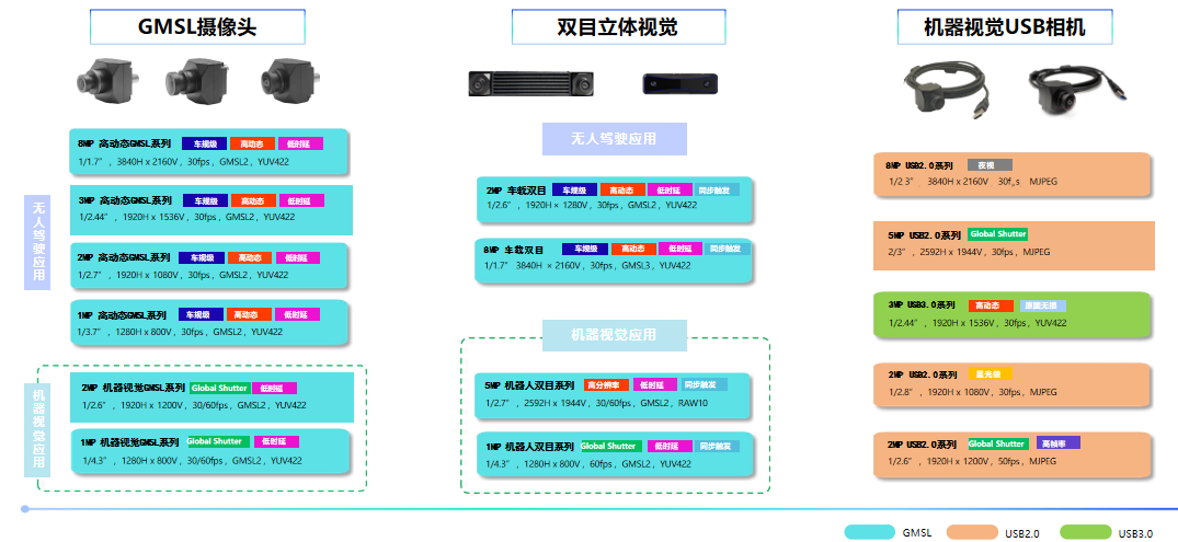场景需求: AGV&AMR常需要在高强度运作、 多电磁干扰的工业场景下 , 实现稳定、精准且实时的自主定位、 导航与障碍物识别 ,确保物流搬运的高效与安全。 产品应用: 机器视觉GMSL系列 GMSL摄像头具备高带宽、 低延迟特性保障了高清视频的稳定实时传输; 长达15米的抗干扰同轴传输能力 ,非常适合AGV&AMR范围移动的工况; 单线缆集成供电与数据传输 ( PoC) 极大简化了车载布线 , 提升了系统可靠性与维护性 , 是高性能AGV视觉系统的理想选择。 ■ 多分辨率输出 ,高帧率: 1MP(1280H x 960V)分辨率、2 MP(1920H x 1200V) 分辨率可选 ,30-60fps帧率可选。 ■ GMSL 2传输:采用GMSL 2通信协议传输数据 ,具有高带宽、低延迟等特点。 ■ Global Shutter :采用全局快门 ,可减少高速场景中帧与帧之间的失真和运动伪像。 ■ 高防护设计:具备高防护性能 ,可适应恶劣的工作环境。