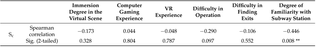 应急逃生能力与LF_increase_rate呈显著负相关(p < 0.05),应急逃生能力与LF/HF_increase_rate呈显著负相关(p < 0.01);LF或LF/HF的增加率越大,应急逃生能力越小,压力过大可能不利于应急逃生。个人应急逃生能力与对紫荆山地铁站的熟悉程度呈极显著负相关(p < 0.01)。