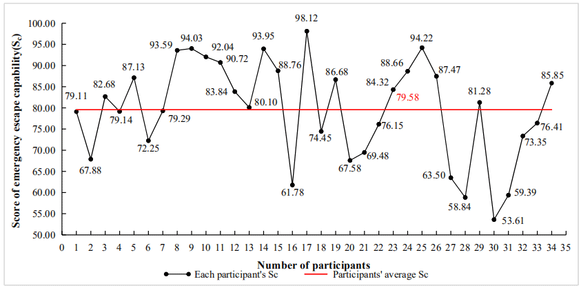 对每位参与者的应急逃生能力进行定量评估,并分析相关影响因素。结果表明,对于实验中的年龄范围(19-22岁),女性的应急逃生能力明显低于男性(p < 0.05);虽然DISC型人格的应急逃生能力无显著性(p > 0.05),但影响型人格平均紧急逃生能力最差,顺从型应急逃生能力最好;与基线相比,虚拟火灾逃生期间,Mean_SC 和 Mean_HR 都显著增加(所有 p < 0.01)。