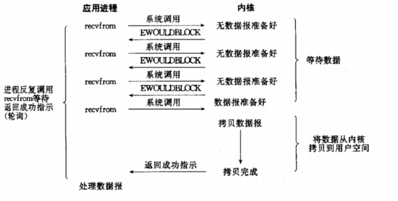 非阻塞IO: 如果内核还未将数据准备好, 系统调用仍然会直接返回, 并且返回EWOULDBLOCK错误码.