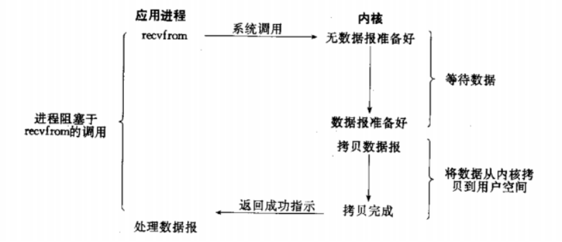 阻塞IO: 在内核将数据准备好之前, 系统调用会一直等待. 所有的套接字, 默认都是阻塞方式.