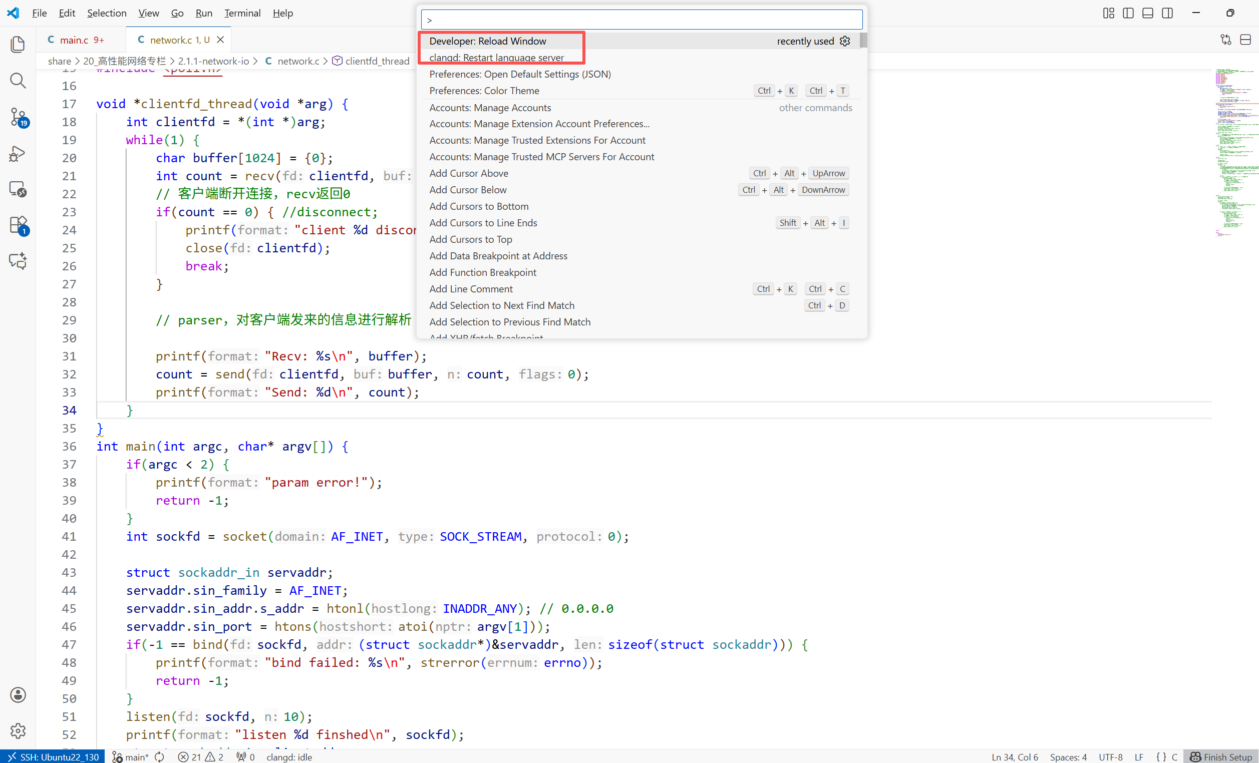 如果没有显示的话,可以使用ctrl + shift p, reload一下window, 或者restart一下clangd