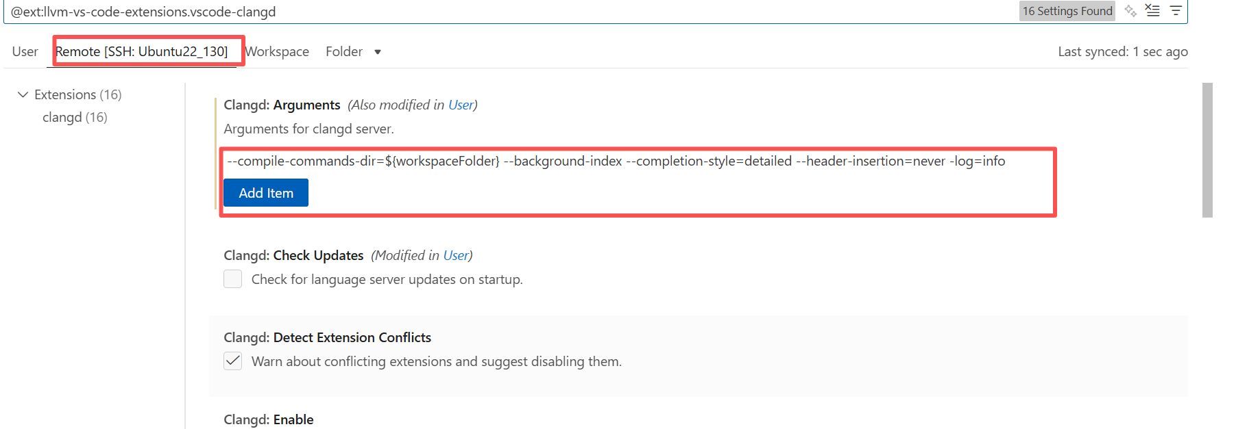 配置Clangd: Arguments, 点击Add Item, 加入下面的配置。