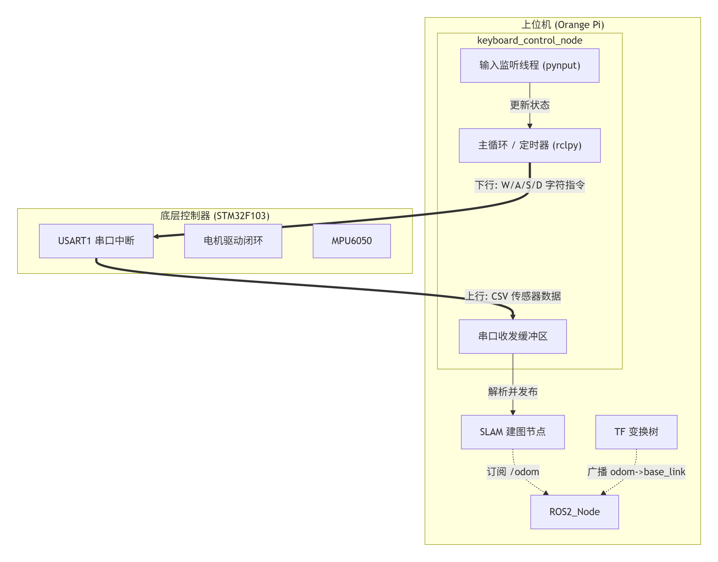 在早期架构中,控制逻辑(Controller)与硬件接口(Driver)被物理分离。考虑到 STM32 固件采用了高效的字符流控制协议 ,我们将架构精简为集成式驱动模式 。本模块 keyboard_control_node 充当 ROS 2 上位机与底层硬件的唯一交互网关,通过多线程并发机制,同时实现毫秒级的人机交互控制与高频传感器数据采集。
