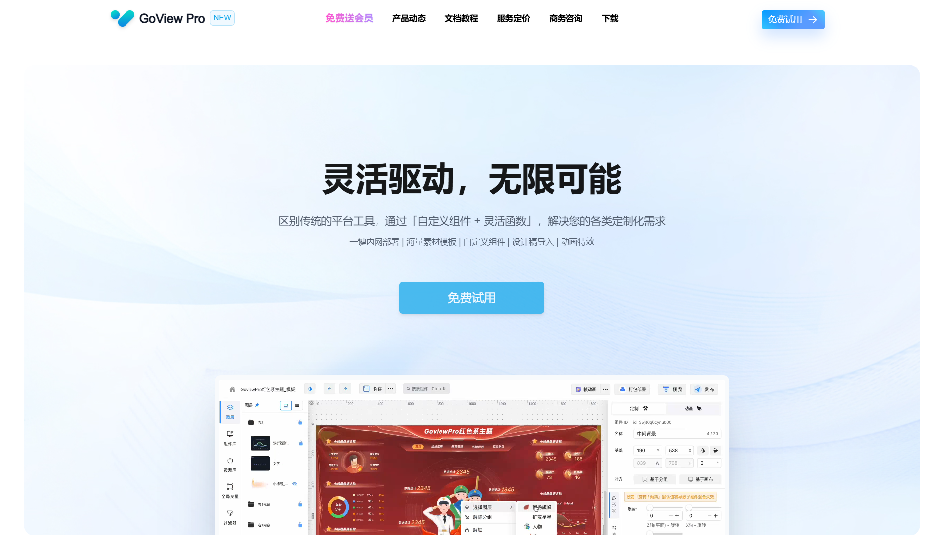 自定义组件:任何会员都可高度定制化组件,无需支付其它费用。集成 Vue 在线编辑器开发,一行代码即可触发事件联动,满足您的定制化业务需求