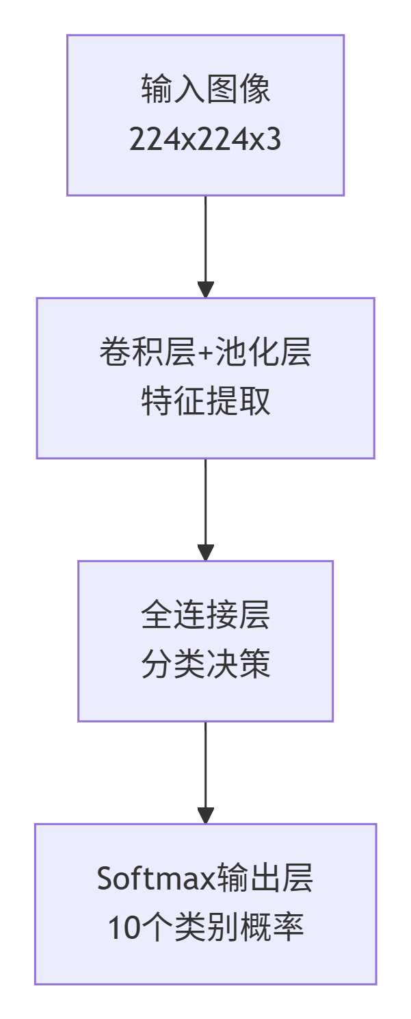 - 特征提取层(核心):包含多个交替的卷积层(提取局部特征)和池化层(降低特征图尺寸,增强鲁棒性),这是CNN的核心结构。