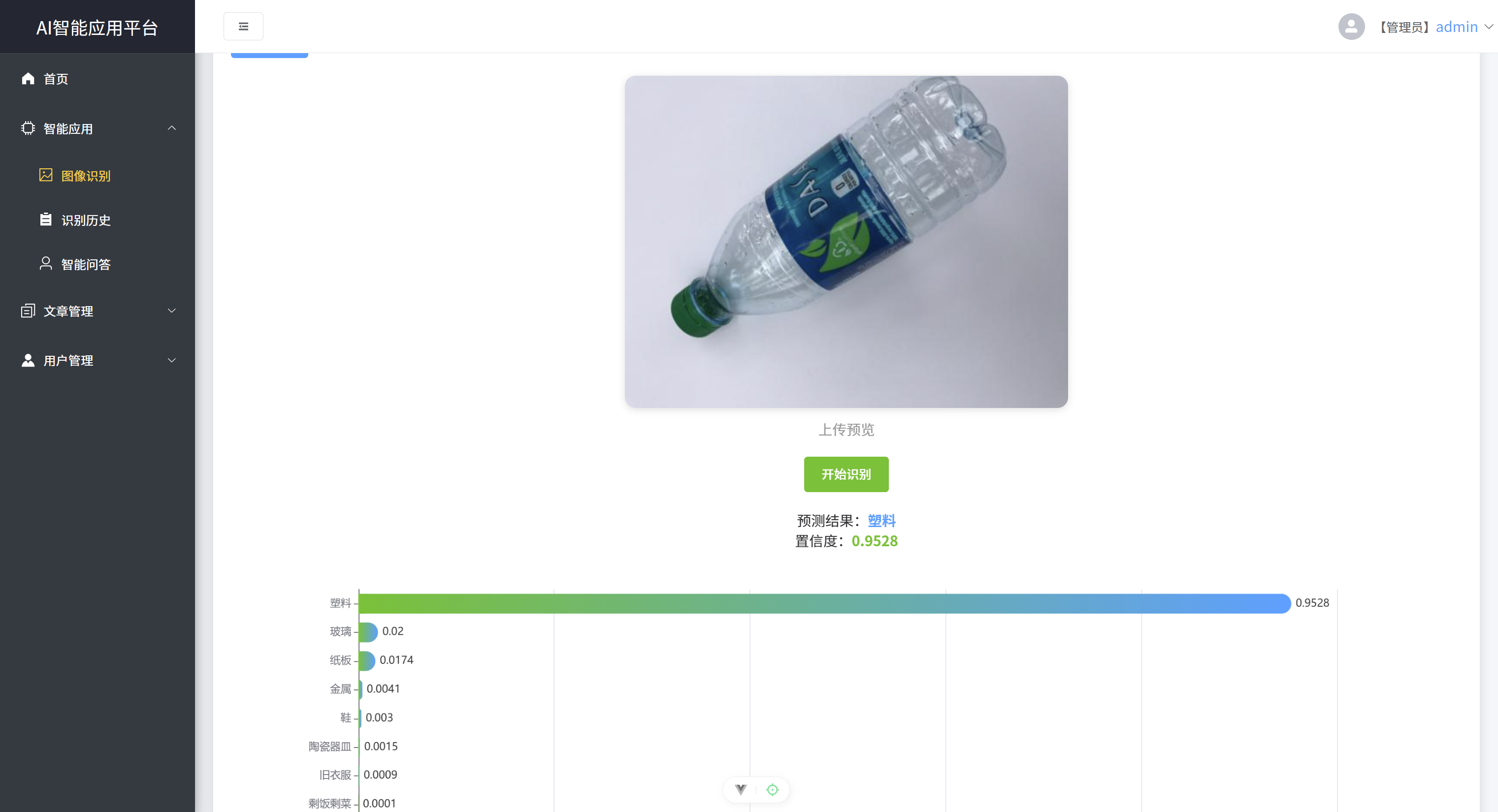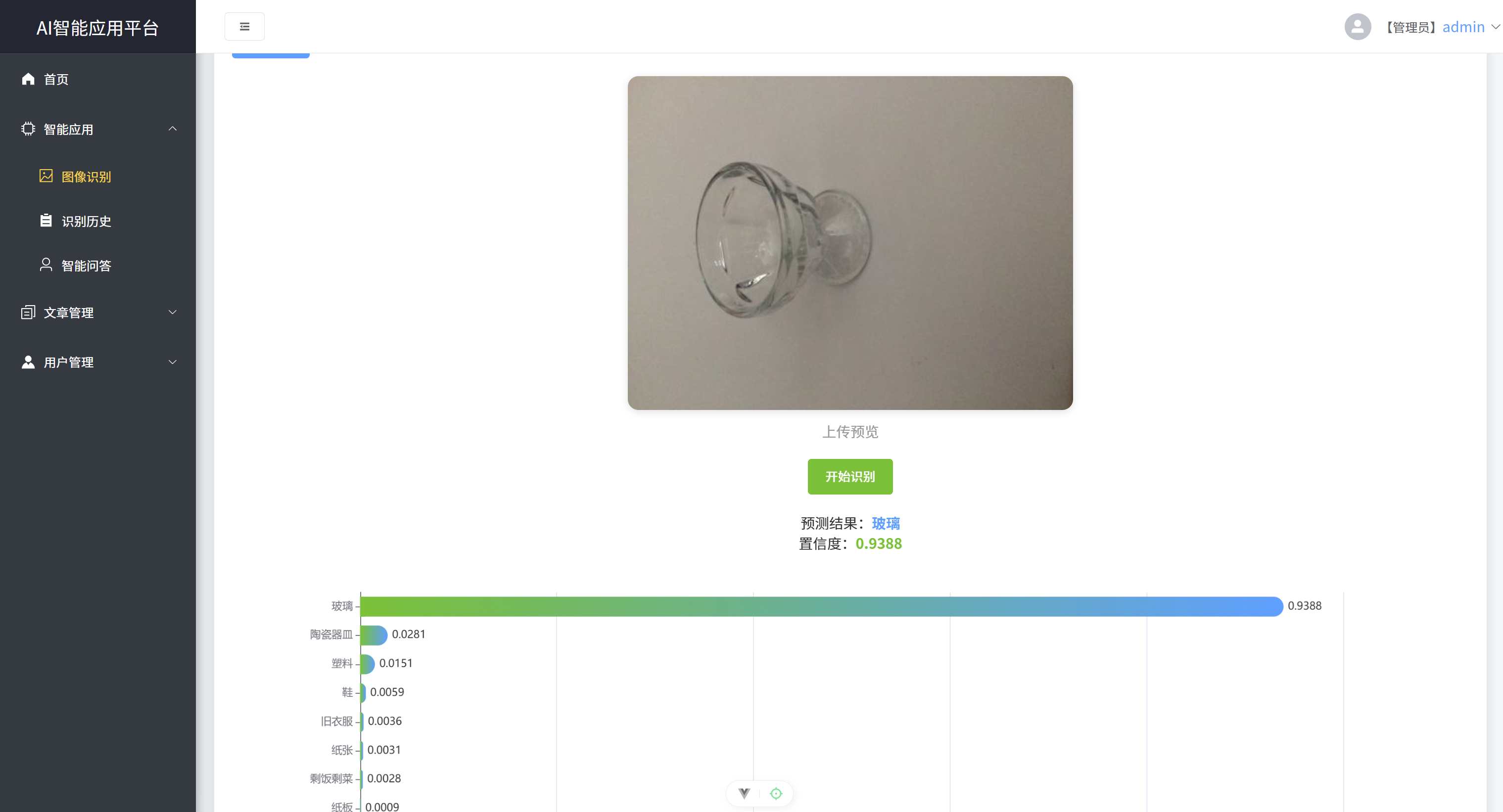 - 在图像识别功能中,用户上传图片后,点击识别,可输出其识别结果和置信度