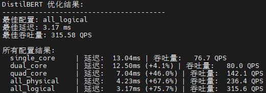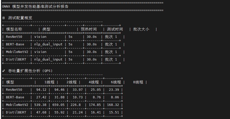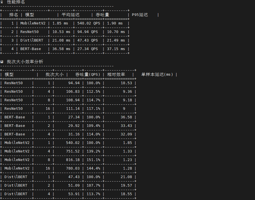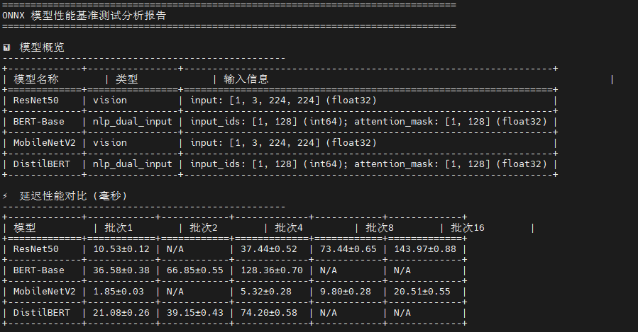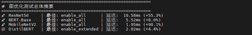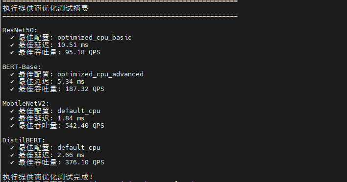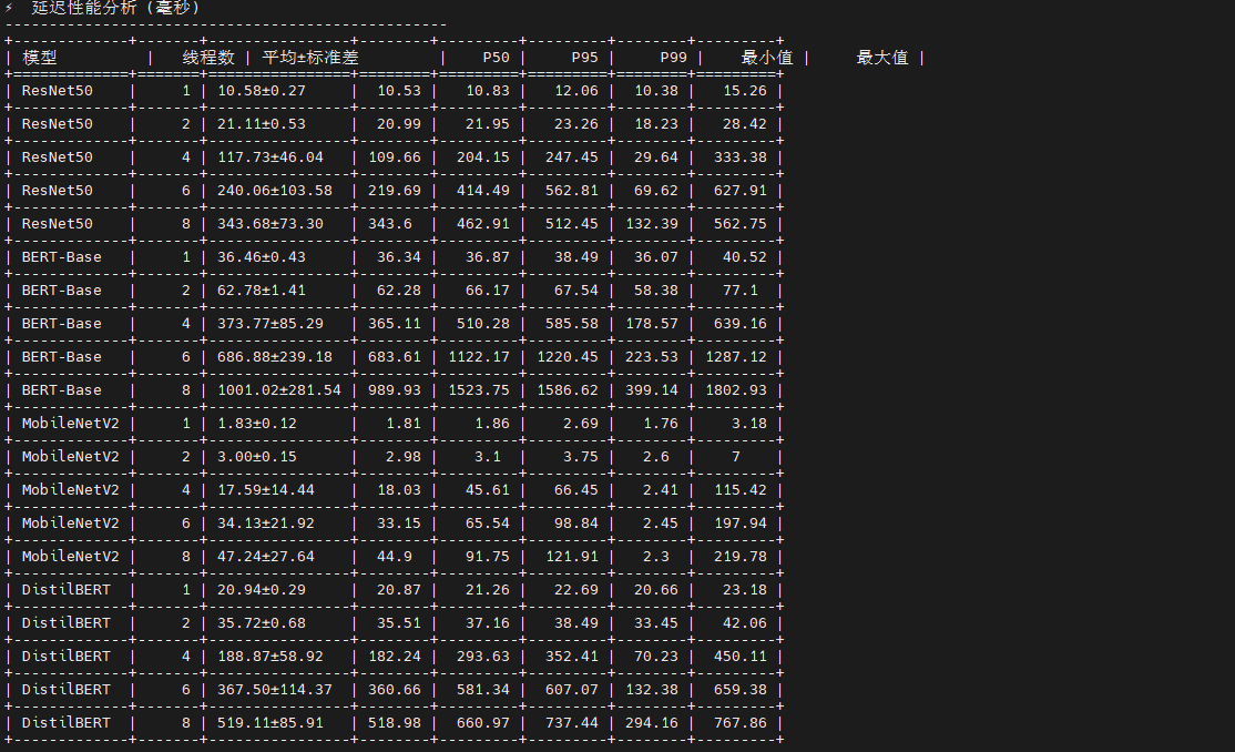 核心发现 :MobileNetV2 单样本推理最快(1.85ms)但图优化"启用所有"后吞吐量爆发 907.3%;ResNet50 在全优化配置下延迟削减 55.3%,16核扩展提升 472%;BERT-Base 仅高级配置受益 1.8%,序列依赖性限制并行度;DistilBERT 精简架构展现最佳多核扩展性(16核提升 311.6%)。