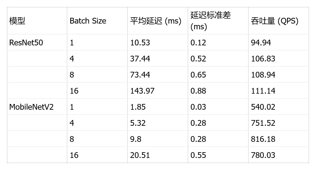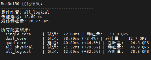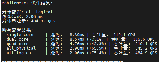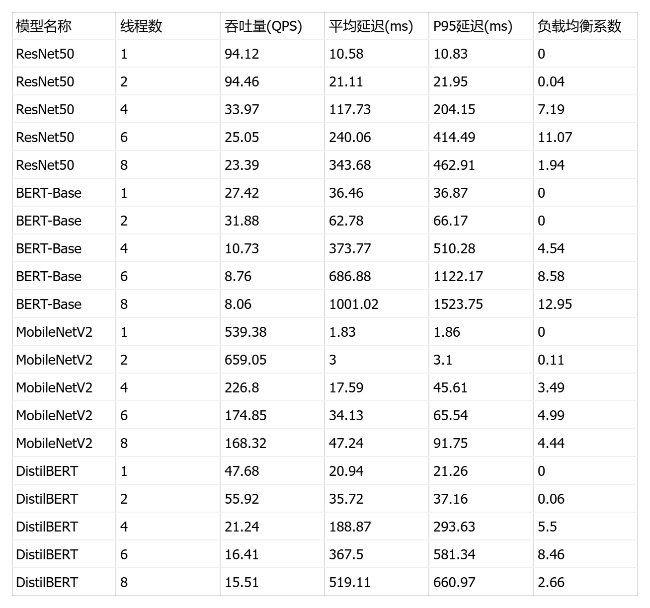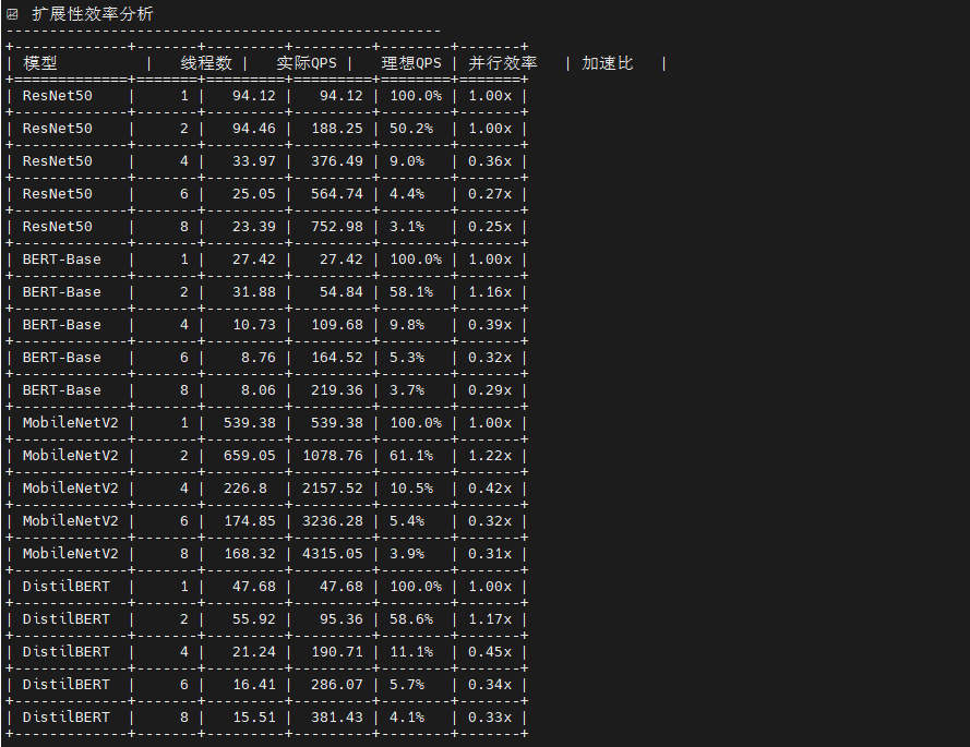 MobileNetV2 同样遭遇双核性能陷阱(延迟增加 2.1%),四核后开始收益,16 核达 484.92 QPS(提升 307.1%);轻量级架构的计算强度较低,扩展效率不及 ResNet50。
