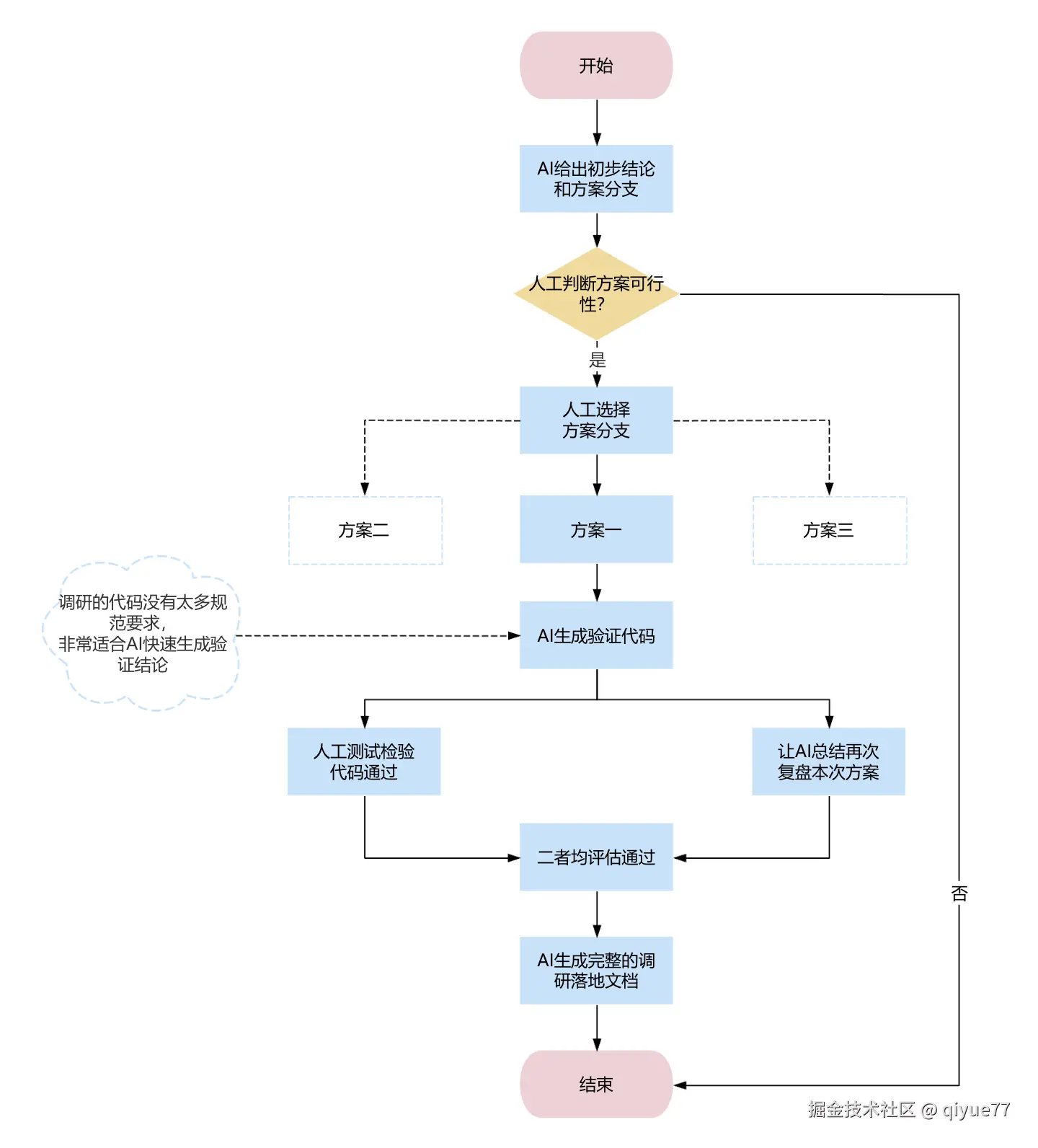 AI给出初步结论和方案分支 => 人工选择方案分支 => 由AI生成验证代码 => 人工测试检验通过 => 让AI总结再次评估可行性 => AI生成完整的调研落地文档