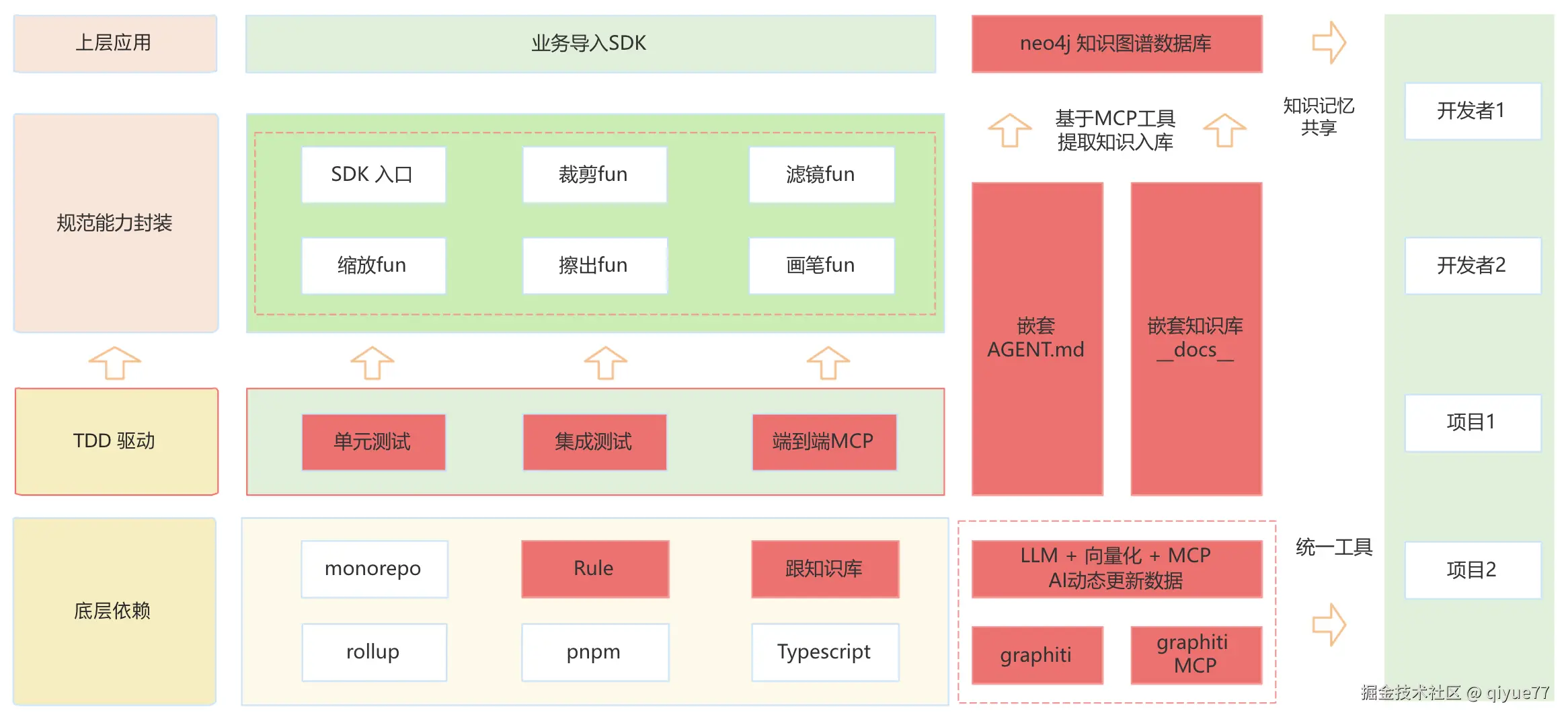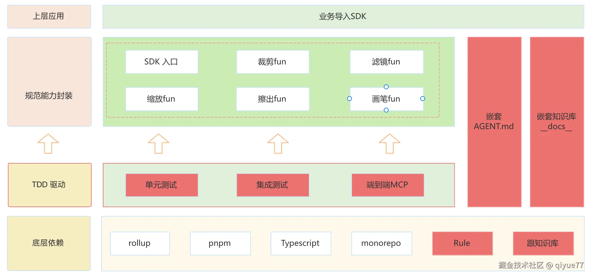 相比与上面业务开发,整体架构多了一层TDD驱动开发,我相信在前端这一行,实际开发中的SDK封装,几乎很少有正经去单元测试,集成测试等内容。对于TDD驱动开发也很少实际应用。