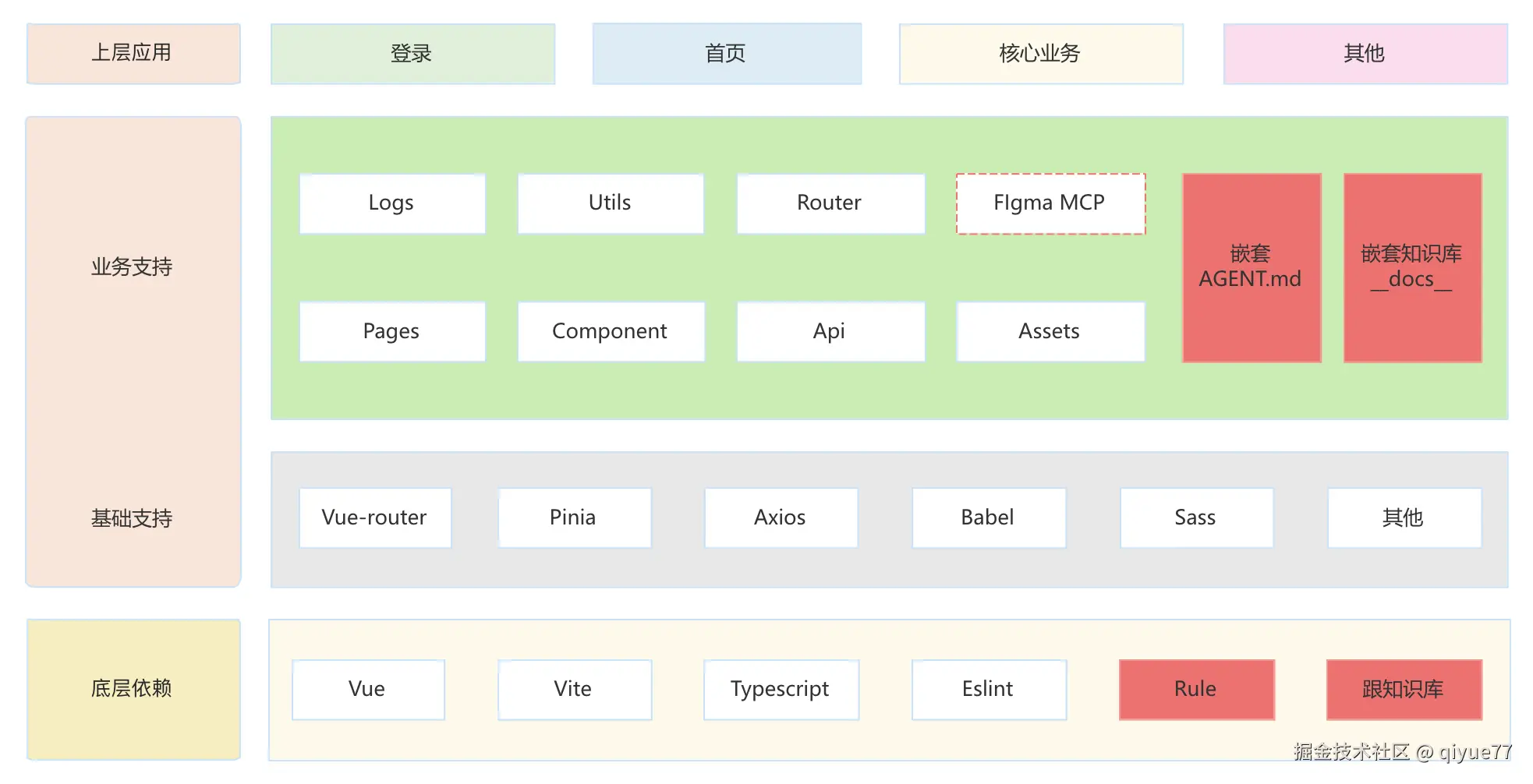 相较于传统架构,Vibe Coding模式增加了 Rule 和 知识库 的依赖,另外如果使用Figma的MCP工具也是开发重点依赖。