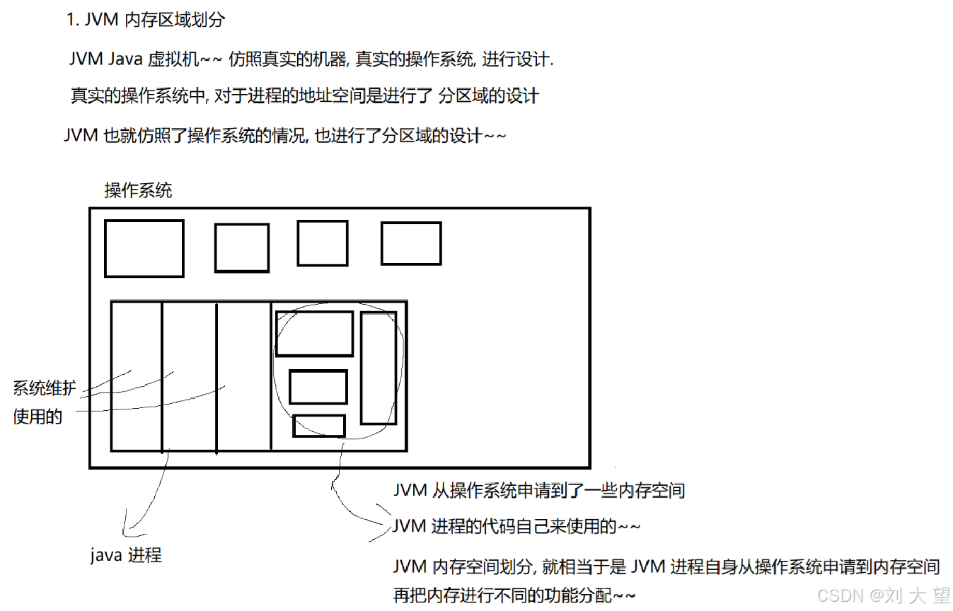 jvm其实是一个java进程,java进程会从操作系统这里申请一大块内存区域,给java代码使用,这一大块内存区域,进一步划分