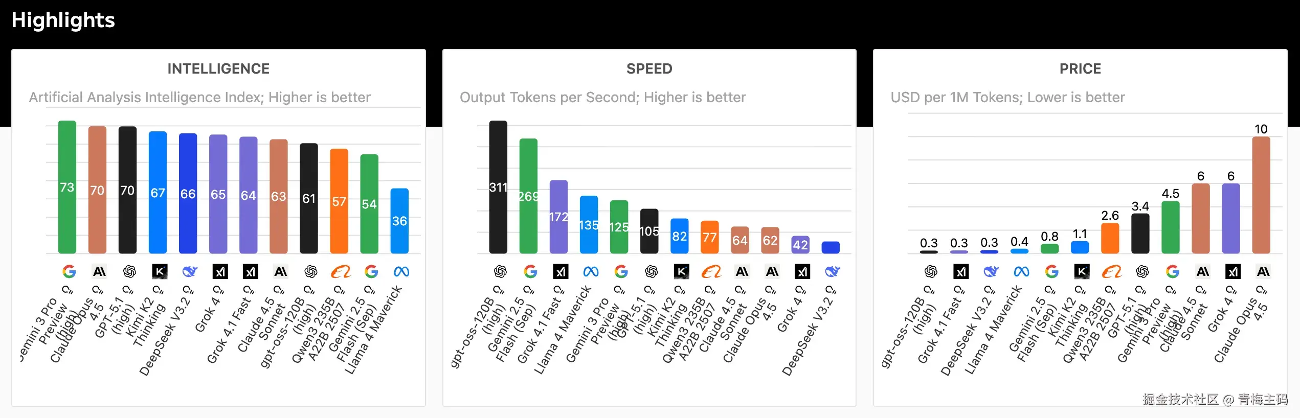 Speed 以输出Tokens per Second (每秒令牌数)衡量,速度越快越适合实时交互,如聊天或直播字幕生成。**gpt-oss-120B (high)**以惊人的312 tokens/s称霸榜单,Gemini 2.5 Flash (Sep)紧随(269 tokens/s),Grok 4.1 Fast(172 tokens/s)和Llama 4 Maverick (135 tokens/s)分列三四位,而 Gemini 3 Pro Preview (high) 以125 tokens/s位列第五。