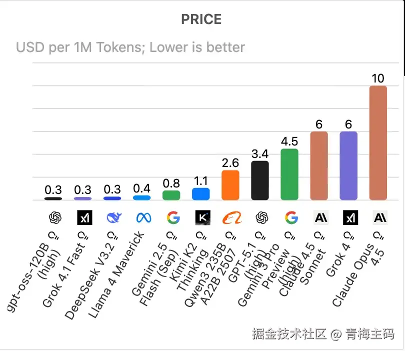 Price 以USD per 1M Tokens (每百万令牌美元成本)计算,越低越亲民。排名中,gpt-oss-120B (high) 、Grok 4.1 Fast 和DeepSeek V3.2 以0.3美元并列最低,Llama 4 Maverick (0.4美元)紧随,而Kimi K2 Thinking 以1.1美元位列中游,Claude Opus 4.5高达10美元垫底。