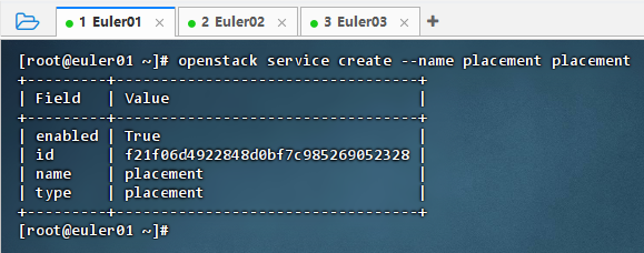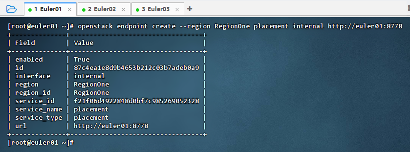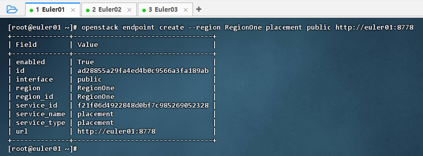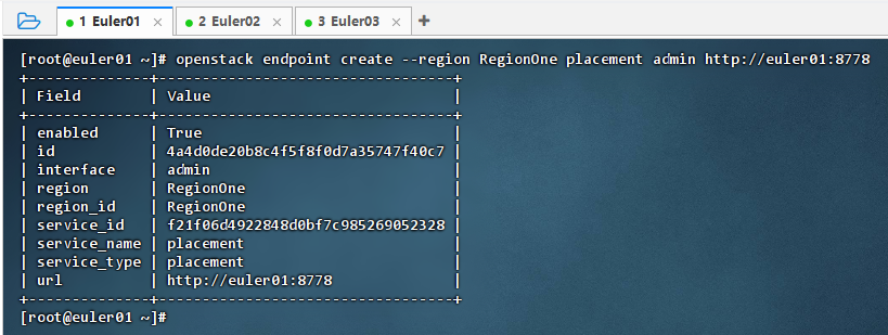 openstack endpoint create --region RegionOne placement admin http://euler01:8778