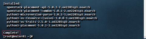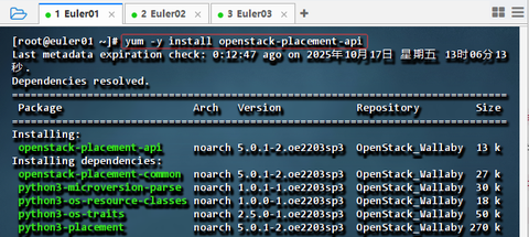 安装说明 :该命令在openEuler系统上安装OpenStack Placement API服务包,-y参数自动确认安装过程中所有的提示,确保安装流程无人值守顺利完成。安装过程会自动解析并安装所有依赖包,包括Python客户端库、WSGI中间件等必要组件。