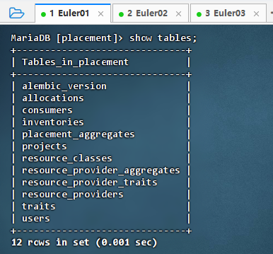 数据库初始化成功后,应该看到12张系统表,这些表分别用于存储资源提供者、库存信息、资源类别、分配记录等关键数据。这些表共同构成了Placement服务的核心数据模型,支撑着资源调度的各项功能。