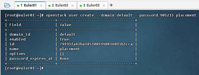 此命令在Keystone中创建了一个名为'placement'的用户,隶属于默认域,使用指定的密码。用户创建成功后,系统会返回用户的唯一标识符,这是一个全局唯一的UUID。
