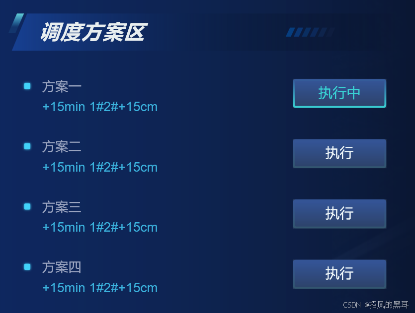 调度方案区紧邻实时数据区,列出了多种预设的调度方案。每个方案都有详细的描述和执行状态,操作人员可以根据需要选择并执行相应的方案。这种设计不仅提高了调度效率,还确保了调度过程的规范性和可追溯性。