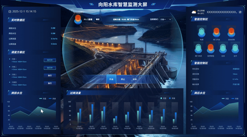 Axure大屏可视化原型设计注重交互性和用户体验。向阳水库智慧监测大屏中的各个功能区域布局合理,操作按钮位置恰当,符合人体工程学原理。此外,大屏还支持PLC连接和重连功能,确保数据的实时性和准确性。