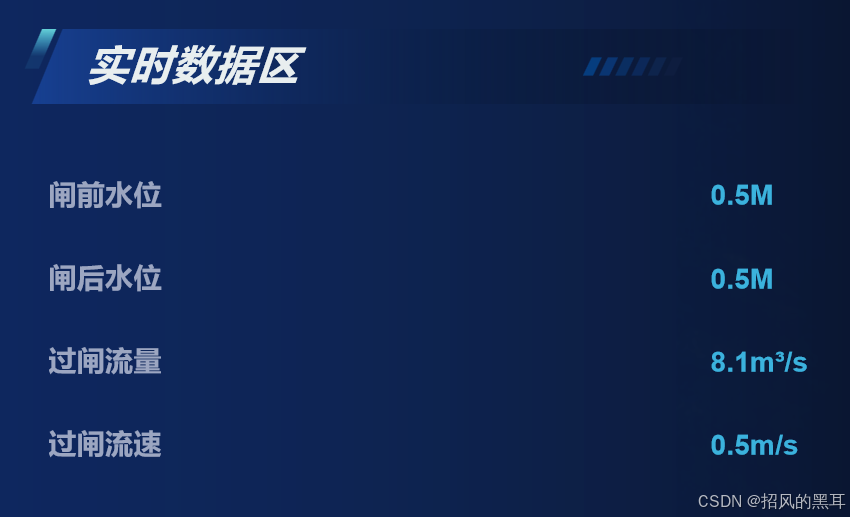 实时数据区位于左上角,显示了闸前水位、闸后水位、过闸流量和过闸流速等关键指标。这些数据以简洁明了的数字形式呈现,便于操作人员快速获取重要信息。