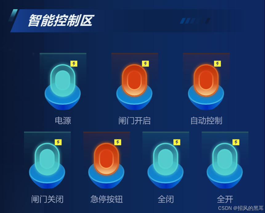 智能控制区位于右上角,包含了电源开关、闸门开启、自动控制等功能按钮。这些按钮采用大图标设计,操作直观方便。此外,还有闸门关闭、急停按钮、全关和全开等紧急控制按钮,确保在紧急情况下能够迅速响应。