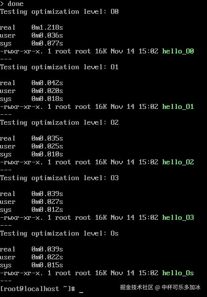 - O3优化:编译时间0.039s,生成文件大小16K