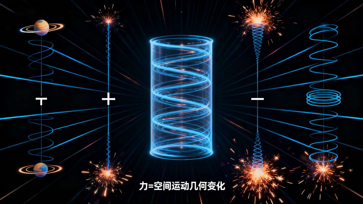 - 迈向大统一:从同一空间运动导出电磁、核力。
