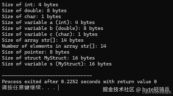 上述字节大小是基于常见的系统和编译器实现得出的通常值。在实际编程中,由于不同的编译器和目标平台可能会有所不同,因此可以使用**sizeof()**函数来获取数据类型在特定平台上的实际字节大小。