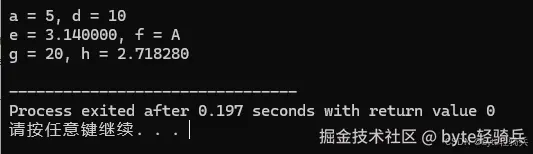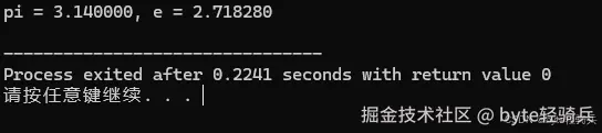 printf("pi = %f, e = %lf\n", pi, e); // 使用%lf打印double类型
