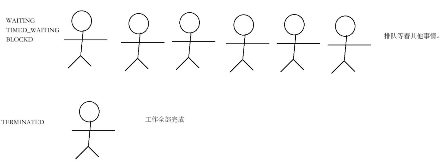 - TERMINATED 工作完成了。内核中的线程已经结束了,但是Thread对象还在