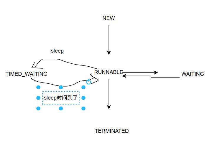 我们举个例子:我的导师给我安排了工作,但我只是接收了导师发的Email,我并没有开始工作,这是就是NEW线程 状态;当我的导师在教我在这个工作中做思维导图的时候,就是RUNNABLE ,当我开始上手做的时候就是RUNNING ,当我被导师叫去办公室的时候,就是进入BLOCKED、WAITING 、TIMED_WAITING 状态;当我将工作完成后就是TERMINATED状态。