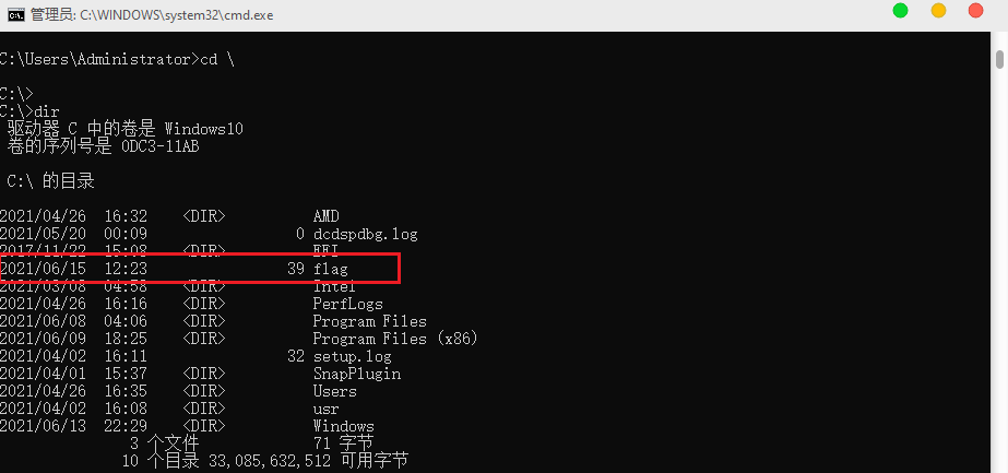由于我们本地win10环境,flag文件放在C盘根目录下,名为flag。