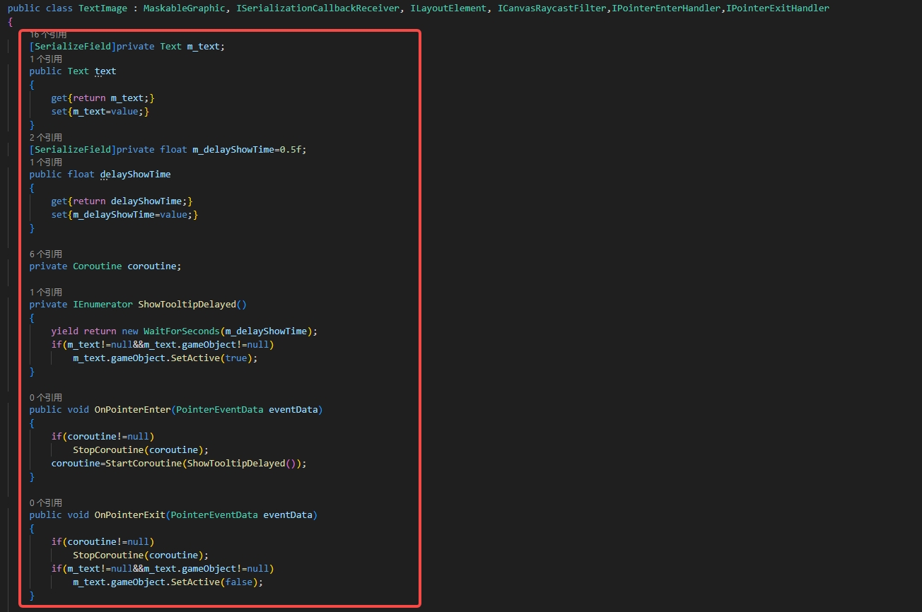 在上一篇我写过创建一个新的扩展Button:Unity自定义按钮-CSDN博客,此文是接在之后的,是创建一个TextImage,它的作用是当鼠标悬浮在Image上一段时间,显示Text文本信息。创建的逻辑与编辑器扩展其实看看源码并修改就可以写出来了,这里作为参考,我会把具体的修改单独拿出来。
