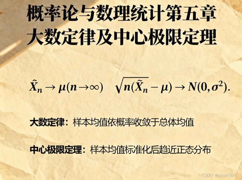 例题 :设 X1,X2,⋯ ,XnX_1, X_2, \cdots, X_nX1,X2,⋯,Xn 是独立同分布的随机变量,且 E(Xi)=μE(X_i)=\muE(Xi)=μ,D(Xi)=σ2D(X_i)=\sigma^2D(Xi)=σ2,则根据辛钦大数定律,当 nnn 充分大时,1n∑i=1nXi\frac{1}{n}\sum_{i=1}^n X_in1∑i=1nXi 依概率收敛于 μ\muμ。