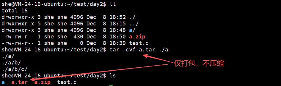 使用范例一:将整个 ./a 目录下的文件全部打包成为 `a.tar`
