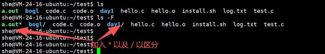 -F:在文件名后附加字符以区分类型(如/表示目录,*表示可执行文件) 。