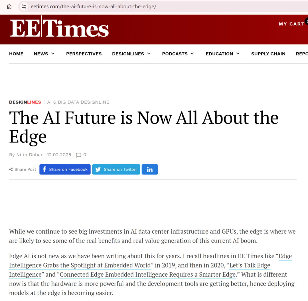 电子工程领域权威媒体 EE Times 最近的一篇深度观察直接抛出暴论:AI 的未来是去中心化的,真正的创新和价值创造,正在向边缘侧(Edge)大规模迁移。