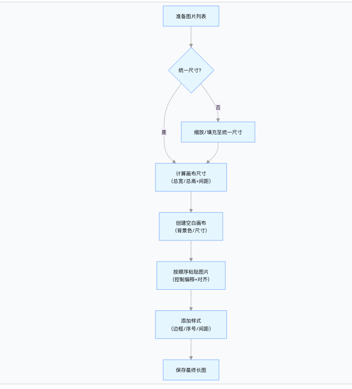 无论哪种方案,长图拼接的核心逻辑一致,流程如下: