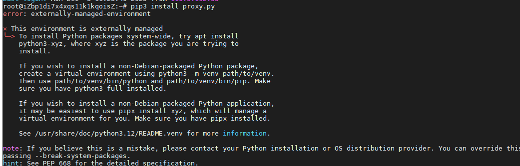 你正在 Debian/Ubuntu 服务器 安装 proxy.py,系统启用了 PEP 668 保护机制 ,不允许 pip 直接写入系统包环境,因此出现: