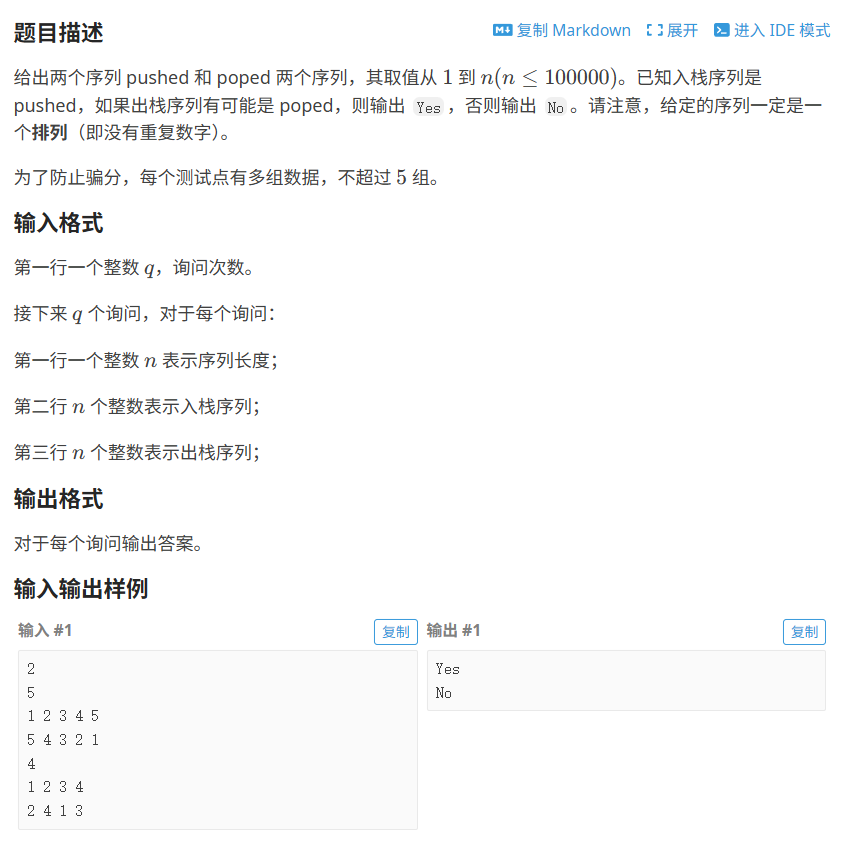 代码易错点:每次进完栈应该要对整个栈进行一次出栈入栈序列的匹对操作,要不然会有元素应该可以出栈的,当前没有出栈,从而导致了结果的错误