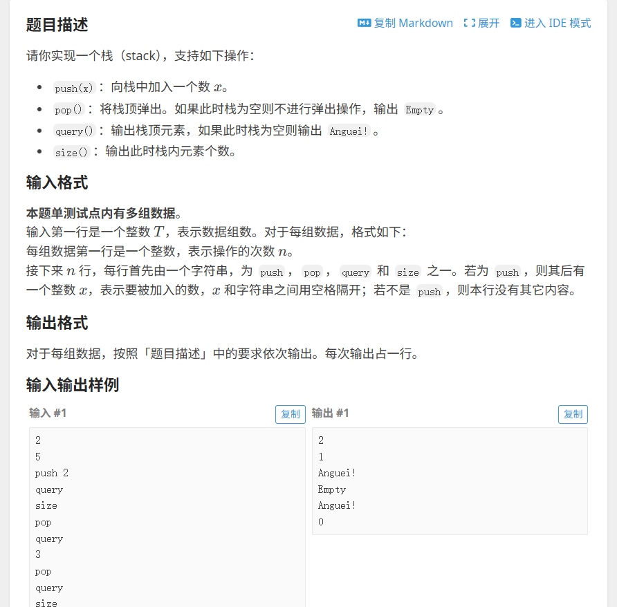 因为有多组测试数据,所以每组数据输入完以后需要清空;因为stack模板没有现成的clear函数,所以可以自定义一个clear函数