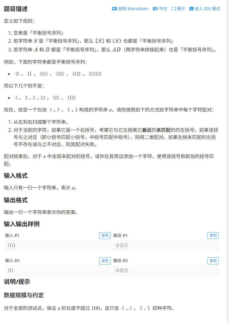 对于当前的字符,如果它是一个右括号,考察它与它左侧离它最近 的未匹配 的的左括号。这也就是为什么示例二的输出是( ) [ ] ( ),而不是( [ ] )