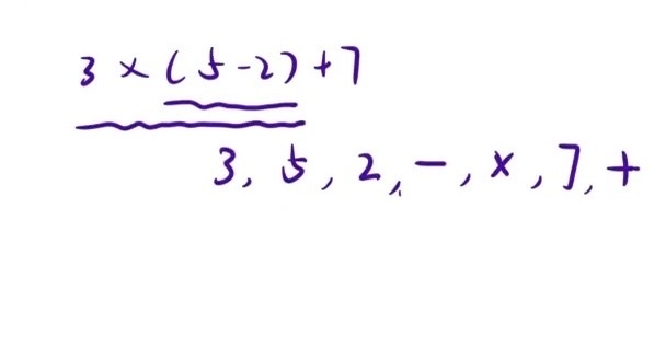 3 × (5-2) + 7 -> 3,5,2,-,×,7,+