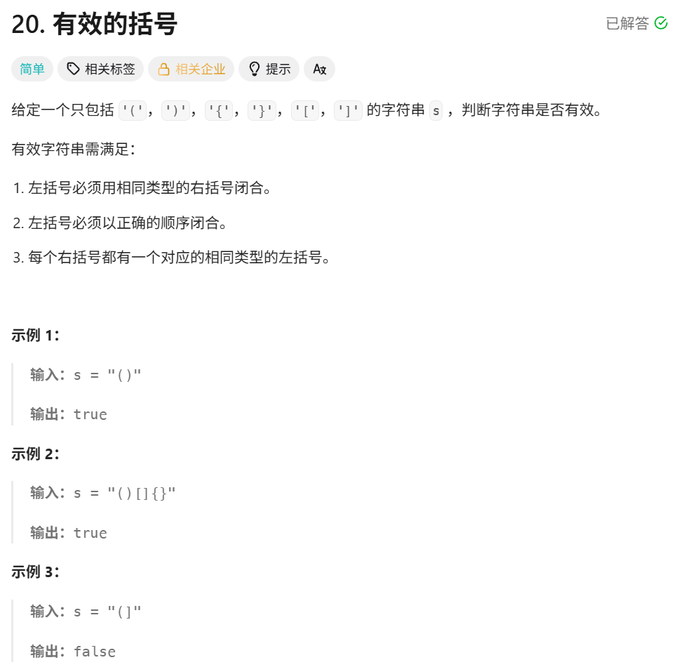 栈的经典模板题,提问括号与括号之间是否能够相互匹配,需要注意的是:{ ( ) } 这种也算是有效的括号